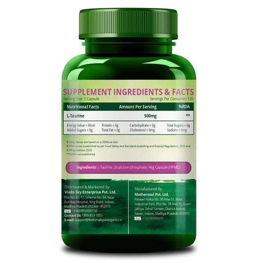 Vlado's Himalayan Organics L-Taurine 500mg Supplement | Support Muscle Recovery | Improve Performance | Promotes Vision & Nerve Health - 120 Veg Capsules