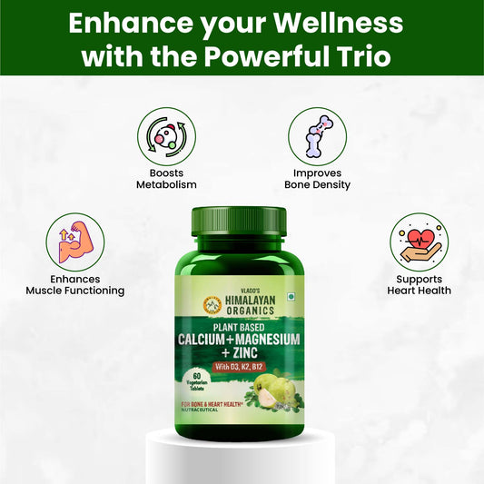 Vlado's Himalayan Organics Plant Based Calcium Magnesium + Zinc | Vitamin D3+k2 Supplement For Stronger Bones | Boost Immunity | Healthy Heart | Muscle Growth - 60Veg Tablets