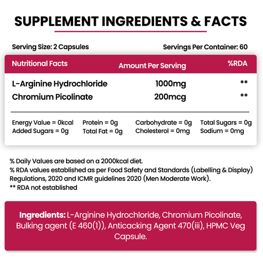 Vlado's Himalayan Organics L-Arginine 1000 mg With Chromium Picolinate Supplement | Improve Muscle Growth Boost Energy And Stamina | Good For Men And Women - 120 Veg Caps