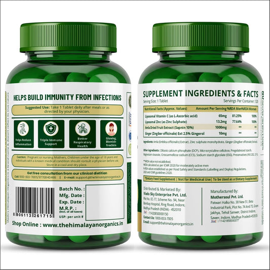Vlado's Himalayan Organics Natural Liposomal Vitamin C Supplements Amla Extract With Zinc For Immunity & Skincare | Antioxidant Vitamin, Skin Rejuvenation I Vitamin C Tablets - 120 Veg Tablets