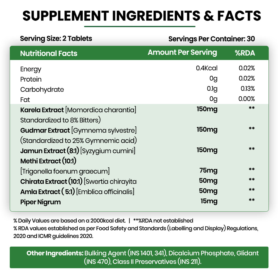 - Perfect ratio of plant-based extracts: Karela, Gudmar, Jamun, Methi, Chirayta, Amla, Piper Nigum