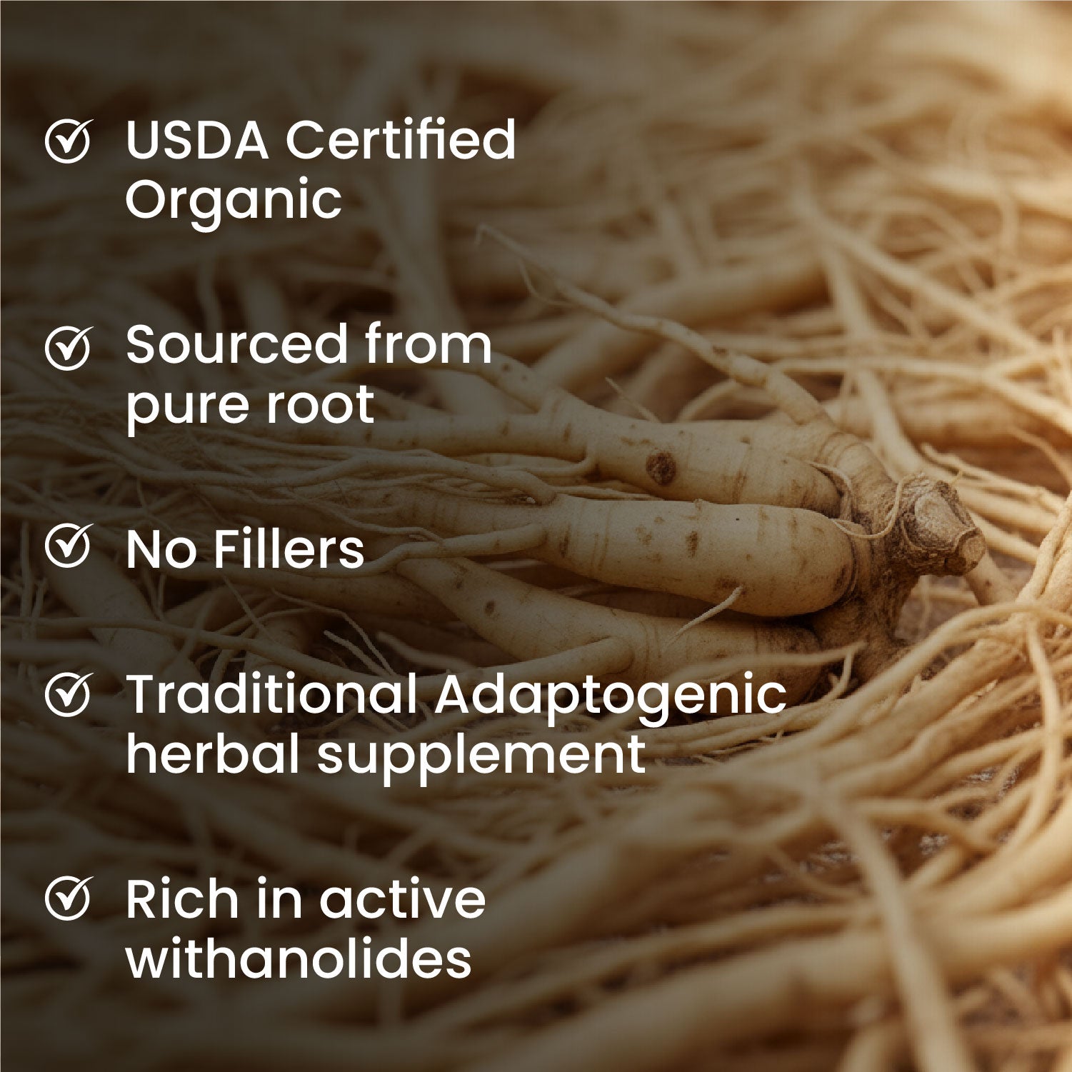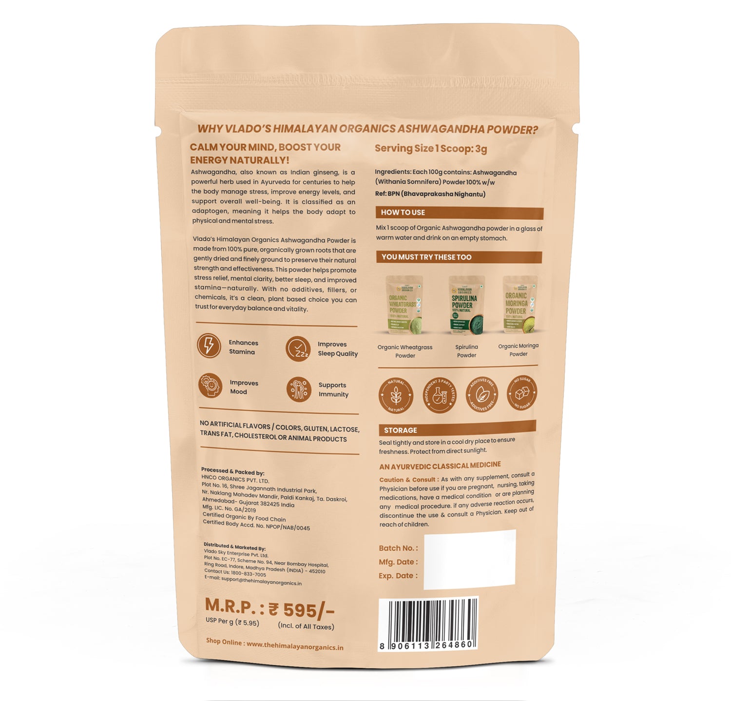 Vlado's Himalayan Organics Ashwagandha Powder is a 100% USDA Organic Certified supplement made from pure, potent Ashwagandha roots. It helps naturally relieve stress, improve sleep, and boost energy and endurance. Rich in adaptogenic benefits, it supports mental clarity, mood balance, and faster recovery. Free from additives, fillers, or preservatives—just clean, plant-powered wellness.