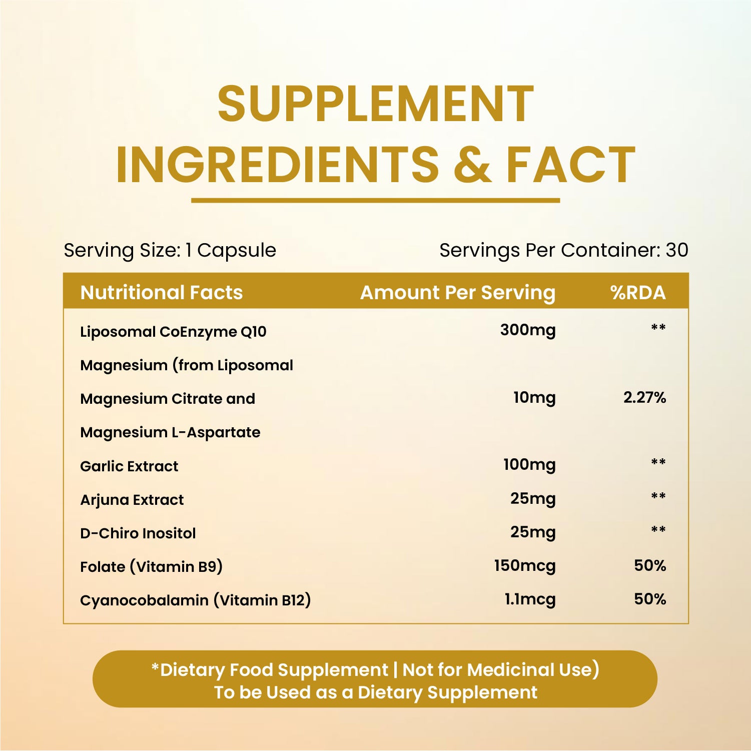 Experience the next generation of energy and heart support with Liposomal CoQ10 300mg, formulated using advanced liposomal technology for maximum absorption and superior bioavailability. Unlike regular CoQ10 supplements, our formula delivers CoQ10 in its active, highly absorbable form, ensuring your body gets the exact nutrient it needs for optimal cellular energy production. CoQ10 (Coenzyme Q10) is a vital antioxidant found naturally in every cell, but levels decline with age, stress, and statin medications. Our high-potency Liposomal CoQ10 helps replenish these levels, supporting a healthy heart, strong energy, sharp brain function, and youthful vitality. Liposomal delivery protects CoQ10 from breakdown in the digestive system, transporting it directly into the bloodstream—making it significantly more effective than standard capsules or softgels.