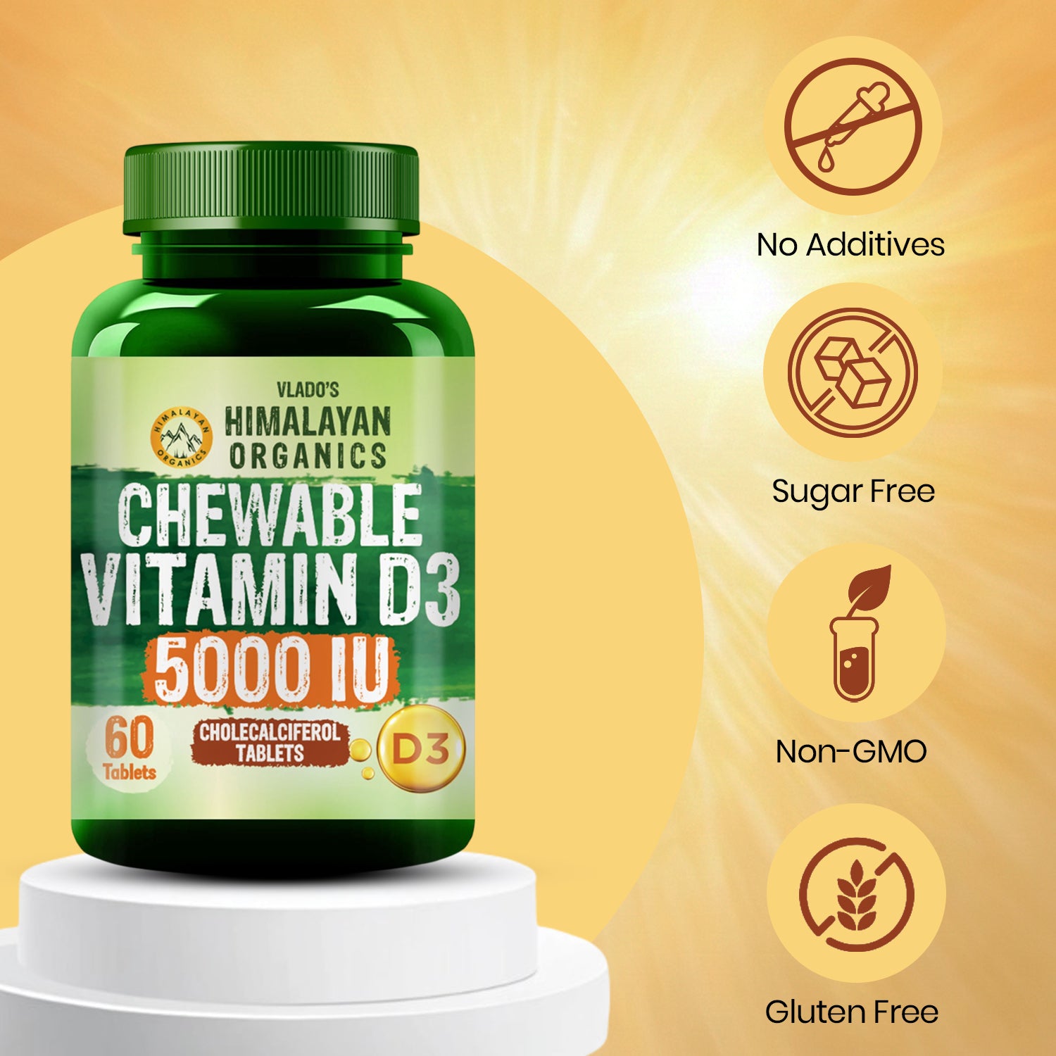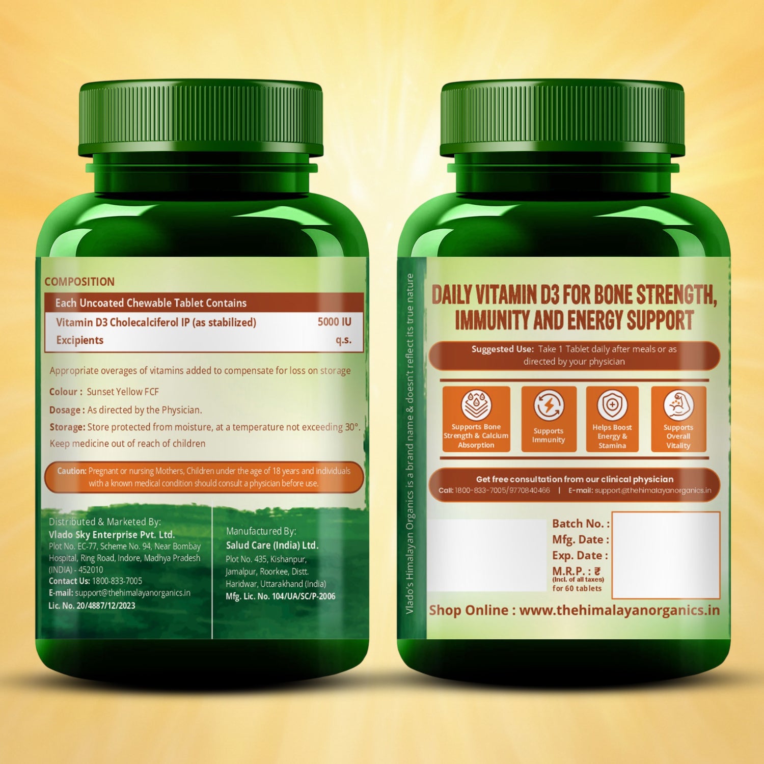 Vlado's Himalayan Organics Vitamin D3 5000IU - Chewable Vitamin D Tablets | Cholecalciferol Vitamin D3 Supplement for Bone & Immunity | For Men And Women | Orange Flavour - 60 Tablets